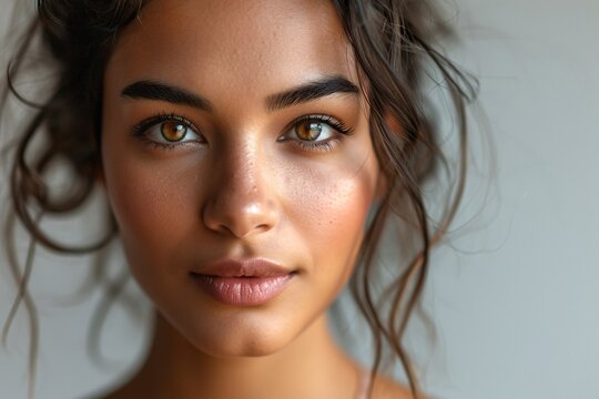 Young female with clean fresh skin. Beautiful woman. Female face and neck. Portrait of young caucasian woman at studio isolated on pastel. Short haircut, long neck, perfect skin. Lifting by gold