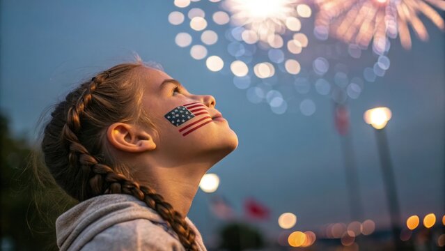 Girl with flag facepaint watching fireworks, festive wonder, celebrating independence against blurred lights backdrop