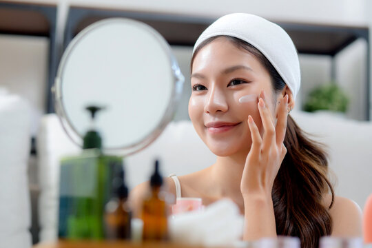 Beauty young asian woman applying cream on facial for wrinkles while looking mirror in living room at home, happy beautiful woman applying lotion moisturizer on cheek for hygiene, skincare and beauty.