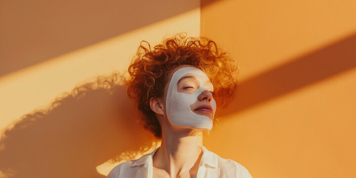 Beautiful redhead woman with spa facial mask, standing in sunlight with orange background