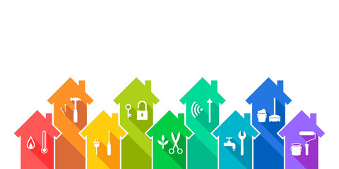 House and related work tool icon set as building, maintenance, renovation, repair or facility management concept