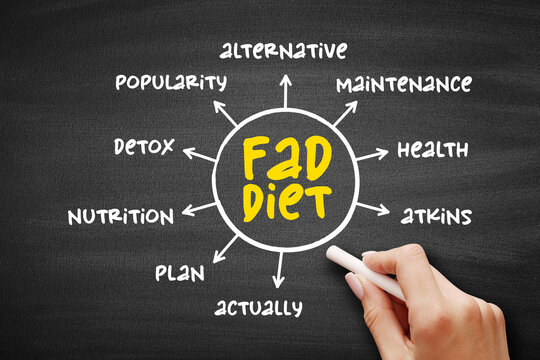 Fad diet - without being a standard dietary recommendation, and often making unreasonable claims for fast weight loss or health improvements, mind map concept on blackboard