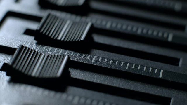 Extreme close up - focused fingers pushing a fader of a mixing console. Professional sound engineer balancing volume of audio inputs of digital audio mixer. Macro footage.