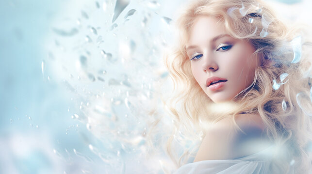 Beautiful young woman with a fair face and smooth skin. Blur background bokeh bubbles. For decorate web pages, assemble products, cosmetics, and skin care creams.