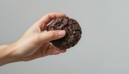 A hand with fair skin holding a chocolate cookie. isolated on white