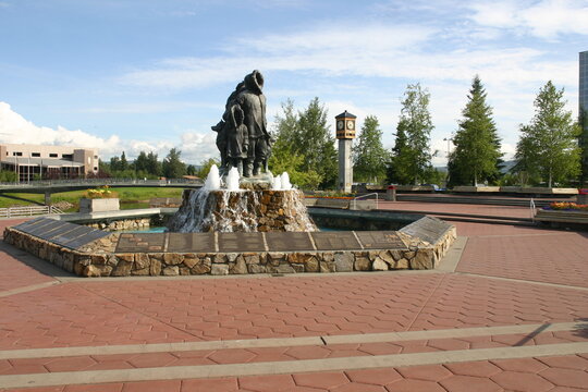 Alaska Inuit Fountain Monument in the Center of Fairbanks, Alaska, Commemorating the The Native American Culture that was in place before the European Settlements in the Public Square Chena River Park