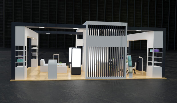 side view of corporate booth with minimalist design and sophisticated details for fairs and exhibitions
