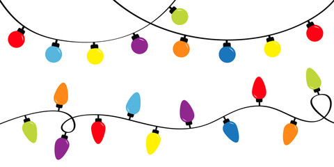 Christmas lights. Holiday festive xmas decoration. Colorful string fairy light set. Lightbulb glowing garland. Rainbow color. Flat design. White background. Isolated.