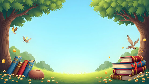Fantasy sleepy landscape with cloudy sky illustration. Generative AI