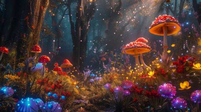mystical forest with mushroom trees, fireflies all around, fairyland