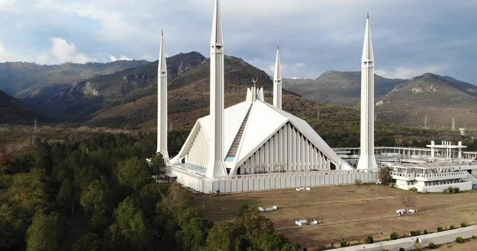 Faisal Mosque Islamabad Pakistan a modern architectural landmark with mountain backdrop aerial view