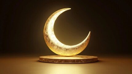 Miniature mosque with crescent moon and stars on a circular base, symbolizing Islamic culture and spirituality against a soft background.