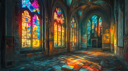 Sanctuary of light: an abandoned chapel bathed in the ethereal glow of stained glass, a reminder of faith and forgotten rituals. [Hollow Monoliths] | Derelict Shrines | abandoned altars. Illustration