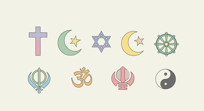 World religious symbol set elements. Collection of shape silhouette - islam, judaism, buddhism, christian, taoism, menorah. Vector flat illustration isolated on white background.