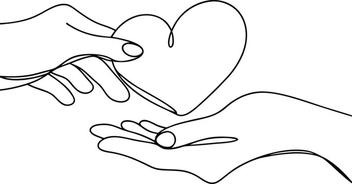 Oneline drawing, hands, heart, love, care, compassion, giving, receiving, sharing, connection