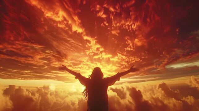 Jesus christ embracing humanity  a symbol of salvation and resurrection against a vibrant sunset sky