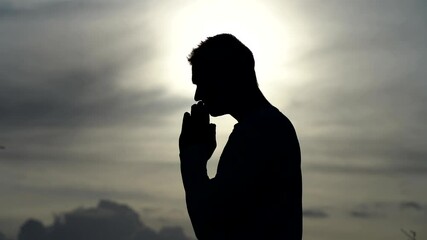 Silhouette of Man pray on during sunset. Religion, faith and hope concept