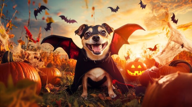 A cute dog dressed as a vampire, sitting in a pumpkin patch, surrounded by Halloween-themed props like spider webs, fake bats, and glowing jack-o'-lanterns. The pet looks excited and playful, shot in