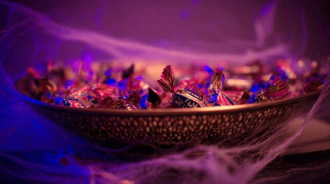 A vintage candy bowl surrounded by plastic bats and cobwebs, set in eerie purple Halloween lighting.