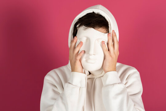 Portrait of a Suspicious young man in white hoodie covering face with a mask. Secret admirer, Hidden identity concept. Isolated on pink background.