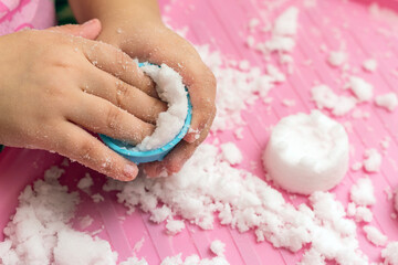 Jib up macro shot of a small Christmas reindeer toy surrounded by fake snow