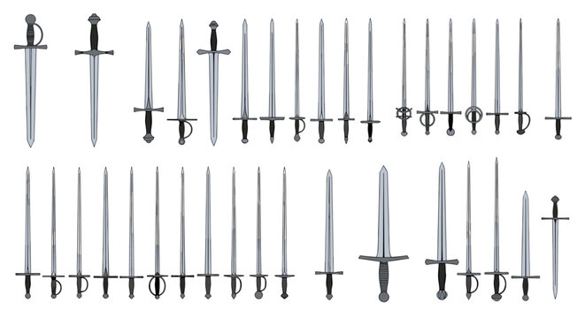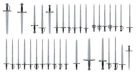 A collection of various medieval swords, isolated on a white background, representing diverse historical blade designs and weaponry elements.