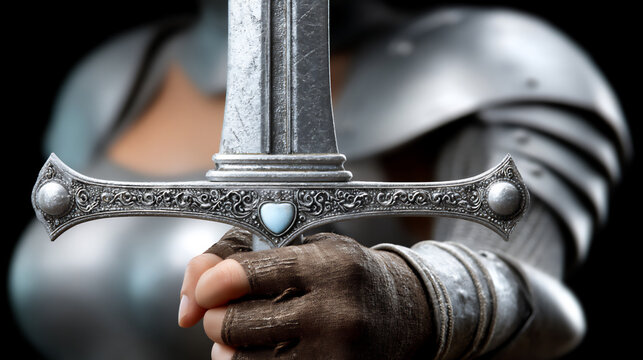 Illustration of a traditional medieval sword with a metallic finish on a white background, ideal for fantasy game graphics or historical