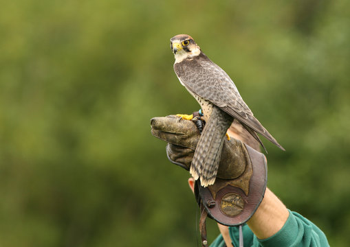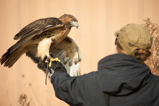 Footage of a Harris eagle perching on the falconer's arm. Slow motion