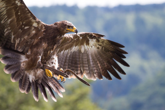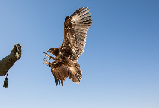 Greater spotted eagle (Clanga clanga) mid-flight during a desert falconry show in Dubai, UAE.