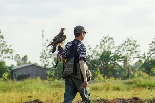 Hunting birds. Hunting with a Saker Falcon. Falcon on a hand at the hunter.