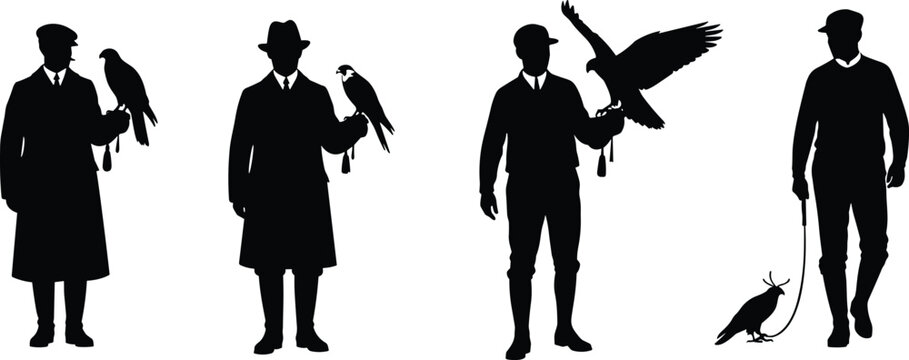 Falconry silhouette vector set, bird of prey icons, black outline style, traditional hunting illustration, outdoor sport design, minimal art