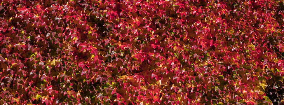 Vibrant red ivy clings to a sunlit wall, creating a warm, seasonal backdrop perfect for autumn decor, garden scenes, and nature inspired marketing materials.
