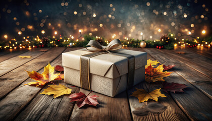 Gift box on rustic wood with fall leaves and lights ideal for holiday and seasonal themes, festive celebrations, and giftgiving concepts.