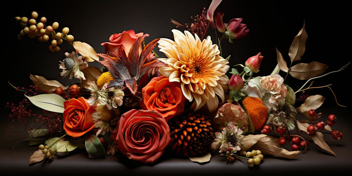 Fall flower bouquet with autumn decor decorations and flowers on white background banner.