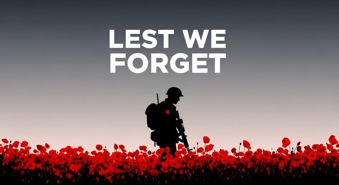 A Moment of Remembrance: A solemn tribute to fallen soldiers, with the silhouette of a soldier standing amidst a field of vibrant red poppies, against a backdrop of a somber sky.