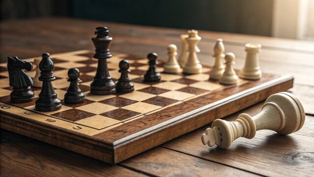 Wooden chessboard with chess pieces arranged for a game, a black king piece fallen on its side in foreground.  Suggests strategy, intellect, and a paused or finished chess match. Ideal for stock photo