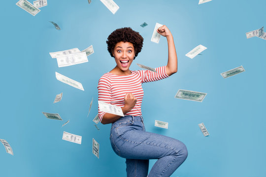 4K Extremely happy woman receives unexpected financial windfall, lots of cash notes falling from above. Slow motion.