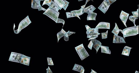 Dollars falling in looped animation. Alpha mask. money rain, raining money, dollars falling.