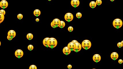 Dollar eyes emoji. Money face emoticon with green tongue. Yellow face emoji. Animated falling emojis. Social media icons symbol animation with green screen background.