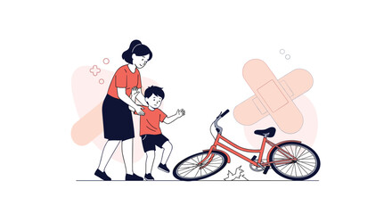 Compassionate mother comforts her young child who just fell off a bicycle in an outdoor area with band-aid motifs.