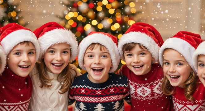Group of happy children in Santa hats and festive sweaters. Smiling kids celebrating Christmas with falling snow and blurred tree background
