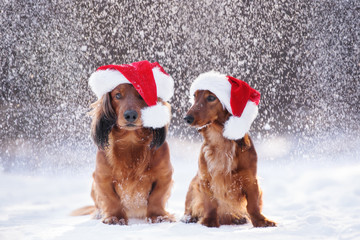 Festive owls in santa hats perched on snowy branch with falling snowflakes