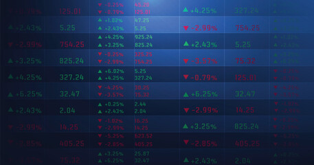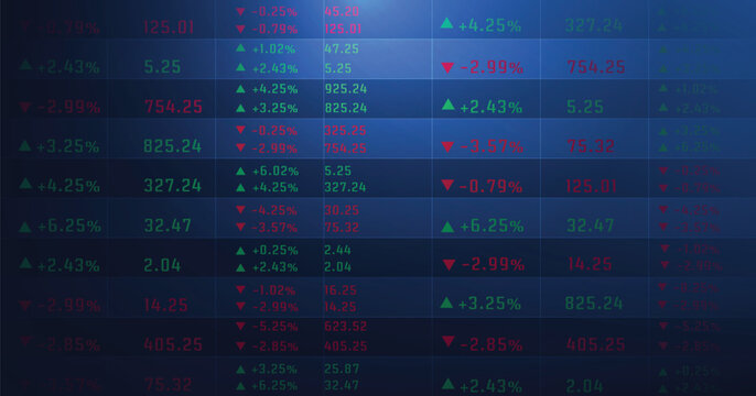Display of stock market numbers. The rise and fall of the stock market on a dark blue background.