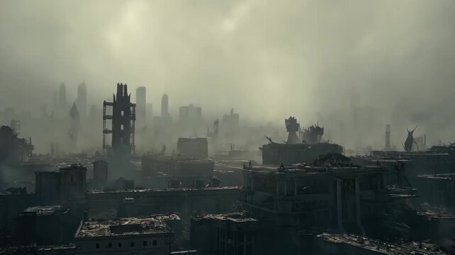 Polluted air engulfs decaying metropolis under sickly, yellow-green sky. Skeletal frames of former towers loom over rubble-strewn streets in this grim panorama. Nuclear fallout or environmental
