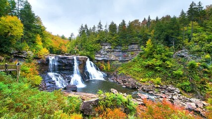 Blackwater Falls waterfall in state park, West Virginia at colorful autumn fall season with water flowing and people on boardwalk overlook