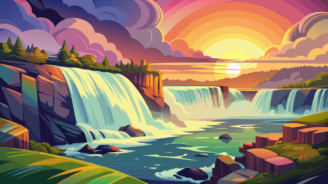 Niagara Falls, Ontario – Majestic waterfalls glow in the sunrise light, with swirling mist and natural rainbows amplifying their awe-inspiring power.