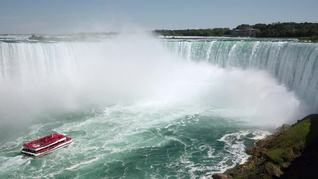 Locked-off shot of Niagara Falls showing tour boat approaching the famous Horseshoe waterfall on the border of US and Canada.