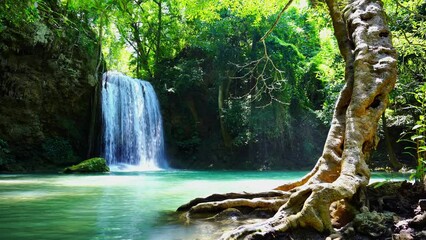 Cartoon waterfalls. Natural scenic waterfall with water streams falls from cliff or mountain river cascade for travel tourist vacation in tropical jungle, neat vector illustration