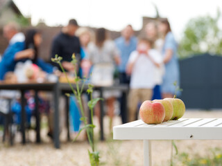 Trois pommes posées sur une table de jardin blanche, en avant-plan d’une scène floue de rassemblement familial en extérieur
