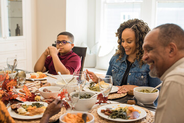 Multigenerational black family eating Thanksgiving dinner together at dining room table